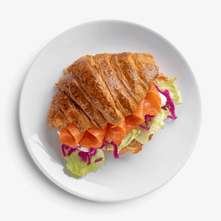 Toasted crispy croissant with fresh salmon and salad